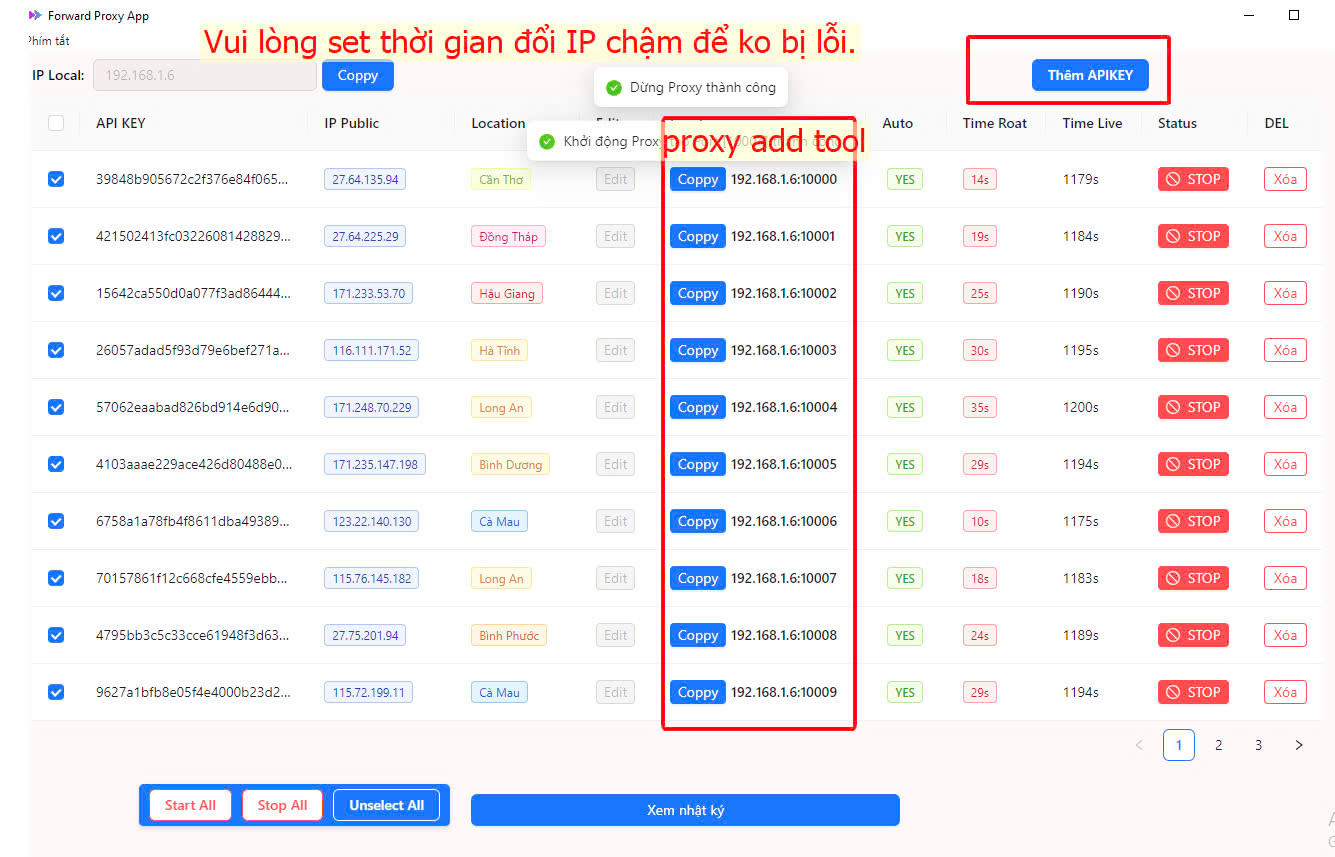 - Phần mềm chuyển proxy key sang IP:PORT để dùng local nếu tool chưa tích hợp API: Click xem ảnh tool hoặc Click Download